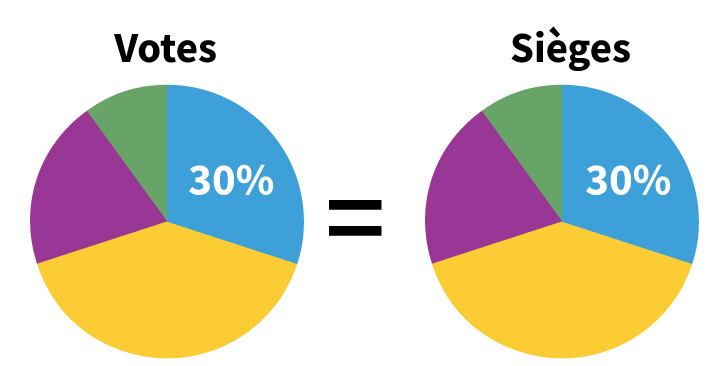 La représentation proportionnelle (RP) est un principe selon lequel le pourcentage de sièges dont dispose un parti au sein du corps législatif doit refléter le pourcentage de personnes ayant voté pour ce parti. Si un parti obtient 30 % des votes, il devrait obtenir environ 30 % des sièges. C’est le mode de scrutin le plus répandu dans le monde.